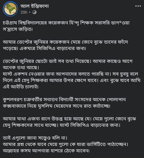 সম্প্রতি ‘আল ইন্তিফাদা’ নামে একটি ফেসবুক পেজ, যা পাকিস্তানভিত্তিক কিছু উগ্র সংগঠনের অনুসারী বলে পরিচিত, সেখানে একাধিক পোস্টে দাবি করা হয়েছে যে, চট্টগ্রাম বিশ্ববিদ্যালয়ের কিছু হিন্দু শিক্ষক নাকি “অনৈতিক কার্যকলাপে” জড়িত। তারা আরও লিখেছে, এই শিক্ষকরা নাকি “কক্সবাজারে মুসলিম মেয়েদের সিজিপিএ বাড়ানোর আশ্বাস দিয়ে রাত কাটানোর জন্য নিয়ে যান”—যা সম্পূর্ণ মিথ্যা, বানোয়াট ও ভিত্তিহীন অভিযোগ।