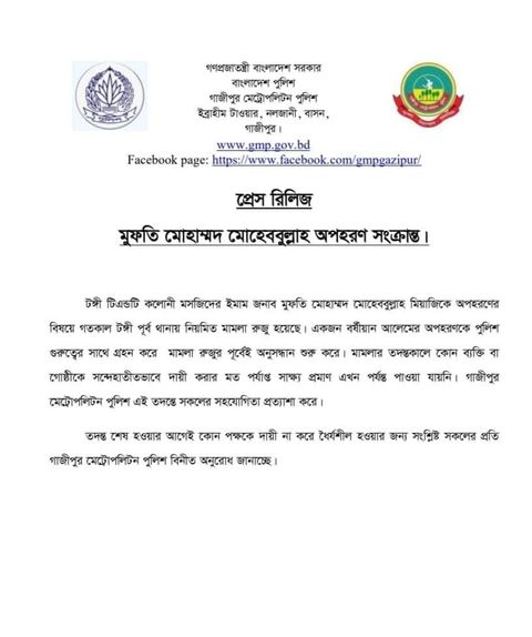 শনিবার (২৫ অক্টোবর) গণমাধ্যমে প্রেরিত এক প্রেস বিজ্ঞপ্তিতে জিএমপি জানায়, “মুফতি মোহাম্মদ মোহেববুল্লাহ মিয়াজীকে অপহরণের বিষয়ে টঙ্গী পূর্ব থানায় নির্দিষ্ট মামলা রুজু করা হয়েছে। ঘটনার পরপরই পুলিশ অনুসন্ধান ও তদন্ত কার্যক্রম শুরু করে। তবে তদন্তের এ পর্যায়ে কোনো ব্যক্তি বা গোষ্ঠীকে সন্দেহাতীতভাবে দায়ী করার মতো সাক্ষ্য-প্রমাণ এখনও পাওয়া যায়নি।”