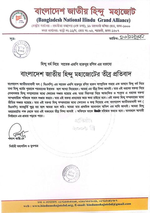 বিএনপি নেতা হারুনুর রশিদের সাম্প্রদায়িক বক্তব্যে সনাতন সংগঠনগুলোর তীব্র নিন্দা–প্রতিবাদ