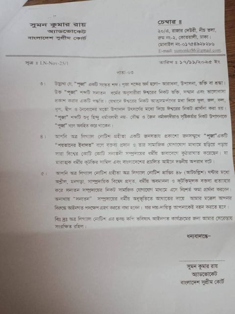 সনাতন ধর্মের অন্যতম প্রধান আচার ‘পূজা’–কে “শয়তানের ইবাদত” বলে উল্লেখ করায় সাবেক সংসদ সদস্য জনাব হারুনুর রশিদের বিরুদ্ধে আইনগত ব্যবস্থা গ্রহণ করা হয়েছে। বাংলাদেশ হিন্দু পরিষদ কেন্দ্রীয় কমিটির মুখপাত্র সাজন কুমার মিস্ত্রীর পক্ষ থেকে ১৭ নভেম্বর ২০২৫ তারিখে পাঠানো এই লিগ্যাল নোটিশে হারুনুর রশিদকে ৪৮ ঘণ্টার মধ্যে প্রকাশ্যে নিঃশর্ত ক্ষমা চাইতে নির্দেশ দেওয়া হয়েছে।
