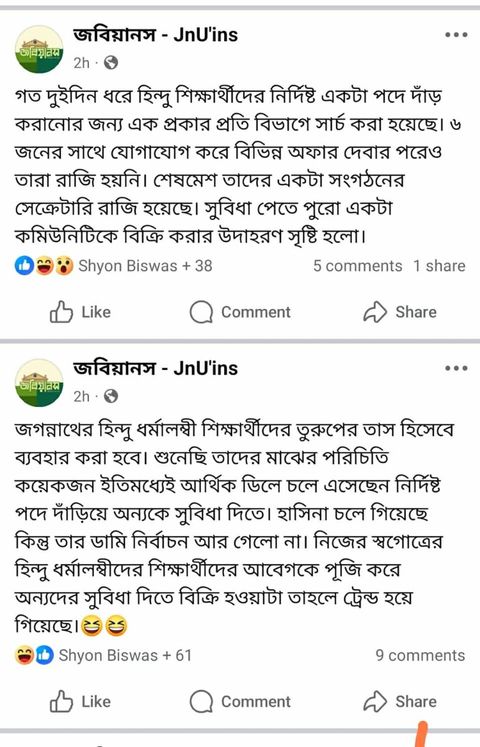 জকসু নির্বাচনের ইতিহাসে ভুয়া তথ্য, গুজব, চরিত্রহনন ও বিভ্রান্তিমূলক পোস্ট নতুন নয়। তবে এবারের ঘটনাটি বিশেষভাবে আলোচনায় এসেছে কারণ এটি সরাসরি ধর্মীয় পরিচয়কে ইস্যু করে একটি সম্পূর্ণ সম্প্রদায়ের বিরুদ্ধে অবমাননাকর ও সন্দেহজনক বর্ণনা তৈরি করছে। শিক্ষার্থীদের মধ্যে তাই উদ্বেগ বেড়েছে যে নির্বাচনকে কেন্দ্র করে ধর্মীয় বিভাজন সৃষ্টি করার চেষ্টা করা হচ্ছে, যা ক্যাম্পাসের শান্তিপূর্ণ পরিবেশের জন্য হুমকি।