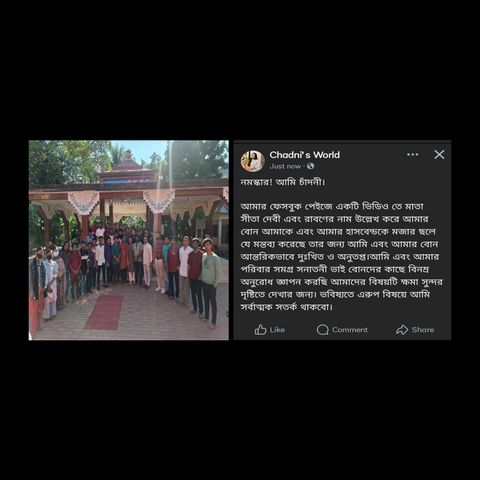 শ্রীমঙ্গলে মর্যাদা পুরুষোত্তম শ্রী রামচন্দ্রের পত্নী সীতা মাতাকে নিয়ে সামাজিক যোগাযোগমাধ্যমে কটূক্তিমূলক ভিডিও প্রকাশের ঘটনায় এলাকাজুড়ে উত্তেজনা তৈরি হলেও শেষ পর্যন্ত তা শান্তিপূর্ণভাবে সমাধানের পথে এগিয়ে যায়। শ্যামল বনিকের মেয়ে চাঁদনী বণিক তার পরিচালিত ‘Chadni's World’ নামের পেজে ধর্মীয় অবমাননাকর ভিডিও প্রকাশ করলে আজ সকাল ১১টায় শ্রীমঙ্গলেশ্বরী কালী মন্দিরে জেলার বিভিন্ন সনাতনী সংগঠনের নেতারা জরুরি বৈঠকে মিলিত হন।
