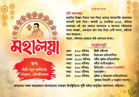 প্রকৃতির চিরন্তন নিয়মে শরৎকাল আবারও ফিরে এসেছে, আর তার সাথে এসেছে আদ্যাশক্তি মহামায়ার আগমনী বার্তা। মৌলভীবাজার শহরের শ্রী শ্রী নতুন কালীবাড়িতে আগামী ২১ সেপ্টেম্বর ২০২৫, রবিবার মহালয়ার এই পুণ্য প্রভাতে আয়োজিত হতে যাচ্ছে এক বর্ণাঢ্য মহালয়া অনুষ্ঠান। দেবী বন্দনা, চণ্ডীপাঠ আর নানা ধরনের সাংস্কৃতিক আয়োজনের মধ্য দিয়ে স্বাগত জানানো হবে দেবী দুর্গাকে।