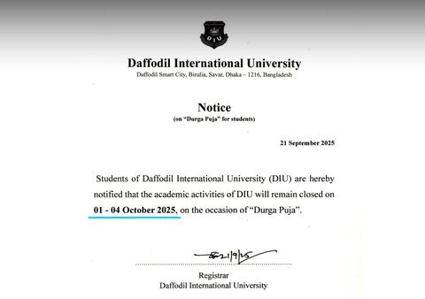 > “ড্যাফোডিল ইন্টারন্যাশনাল ইউনিভার্সিটির একাডেমিক কার্যক্রম ০১ থেকে ০৪ অক্টোবর ২০২৫ পর্যন্ত দুর্গাপূজা উপলক্ষে বন্ধ থাকবে।”