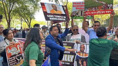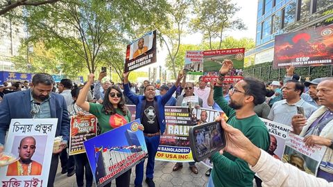 বাংলাদেশে হিন্দু তথা ধর্মীয় ও জাতিগত সংখ্যালঘু সম্প্রদায়ের উপর চলমান নির্যাতন এবং চিন্ময় প্রভুর মুক্তির দাবিতে নিউইয়র্কে জাতিসংঘ সদর দপ্তরের সামনে এক বিক্ষোভ সমাবেশ অনুষ্ঠিত হয়েছে।