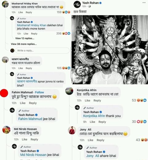 রোববার (২ অক্টোবর) নিজের ভেরিফায়েড ফেসবুক পেজে এক হাতে ‘শুভ বিজয়া’ লিখে দেবী দুর্গার প্রতিমার সামনে তোলা একটি ছবি পোস্ট করেন ইয়াশ রোহান। সঙ্গে সঙ্গেই পোস্টটিতে নেমে আসে নানামুখী প্রতিক্রিয়া। বহু ভক্ত ও শুভাকাঙ্ক্ষী ইতিবাচক মন্তব্য করলেও, কিছু ব্যক্তি সেখানে অভিনেতার ধর্মীয় পরিচয় নিয়ে প্রশ্ন তোলে ও অবমাননাকর মন্তব্য করে বসে।