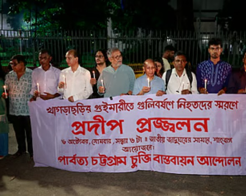 পার্বত্য চট্টগ্রামে চলমান সহিংসতা, ধর্ষণ ও মানবাধিকার লঙ্ঘনের প্রতিবাদে এবং খাগড়াছড়ির গুইমারায় নিহতদের স্মরণে রাজধানীর শাহবাগে জাতীয় জাদুঘরের সামনে সোমবার সন্ধ্যায় প্রদীপ প্রজ্বালন কর্মসূচির আয়োজন করে পার্বত্য চট্টগ্রাম চুক্তি বাস্তবায়ন আন্দোলন। অনুষ্ঠানে বক্তারা বলেন, অন্তর্বর্তী সরকার দায়িত্ব নেওয়ার সময় ন্যায়বিচার ও বৈষম্যহীন সমাজ গঠনের প্রতিশ্রুতি দিলেও পার্বত্য চট্টগ্রামে একদিনও তার প্রতিফলন দেখা যায়নি। বরং এই সময়ে অনেক অন্যায় আড়াল করা হয়েছে এবং মিথ্যাকে সত্যে পরিণত করার প্রবণতা ভয়াবহভাবে বেড়েছে।