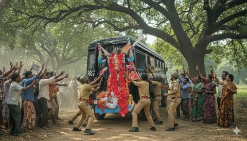 পশ্চিমবঙ্গের দক্ষিণ ২৪ পরগনা জেলার কাকদ্বীপের উত্তর চন্দনপুরে এক চাঞ্চল্যকর ঘটনা ঘটেছে। অভিযোগ, স্থানীয় মন্দির প্রাঙ্গণে পূজার পর ‘মা কালী’র প্রতিমাটি হঠাৎ করেই পুলিশের পিজন ভ্যানে তুলে নিয়ে যায় পুলিশ বাহিনী। এই দৃশ্য দেখে হতবাক হয়ে যান উপস্থিত ভক্ত ও পুণ্যার্থীরা।