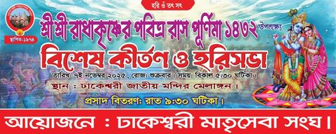 শ্রীশ্রী রাধাকৃষ্ণের পবিত্র রাস পূর্ণিমা ১৪৩২ উপলক্ষে আগামী ৭ নভেম্বর ২০২৫, শুক্রবার ঢাকেশ্বরী জাতীয় মন্দির প্রাঙ্গণে অনুষ্ঠিত হবে এক বিশেষ কীর্তনমেলা ও হরিসভা।
