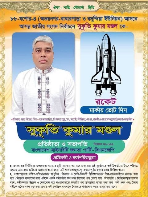 আসন্ন জাতীয় সংসদ নির্বাচনে যশোর-৪ (অভয়নগর, বাঘারপাড়া ও বসুন্দিয়া ইউনিয়ন) আসনে প্রার্থী হিসেবে নির্বাচনে অংশ নিচ্ছেন বাংলাদেশ মাইনরিটি জনতা পার্টি (বিএমজেপি)-এর প্রতিষ্ঠাতা ও সভাপতি সুকৃতি কুমার মণ্ডল। তিনি ইতোমধ্যেই তাঁর নির্বাচনী এলাকার সার্বিক উন্নয়ন, শিক্ষা, স্বাস্থ্য, কর্মসংস্থান ও ধর্মীয় সম্প্রীতি রক্ষায় বিস্তৃত পরিকল্পনা প্রকাশ করেছেন। তাঁর ভাষায়—