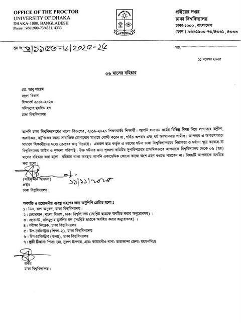 বহিষ্কারের আদেশের অনুলিপি বিশ্ববিদ্যালয়ের বিভিন্ন দপ্তর, সংশ্লিষ্ট বিভাগ, হল প্রাধ্যক্ষ এবং শিক্ষার্থীর স্থায়ী ঠিকানাতেও পাঠানো হয়েছে।