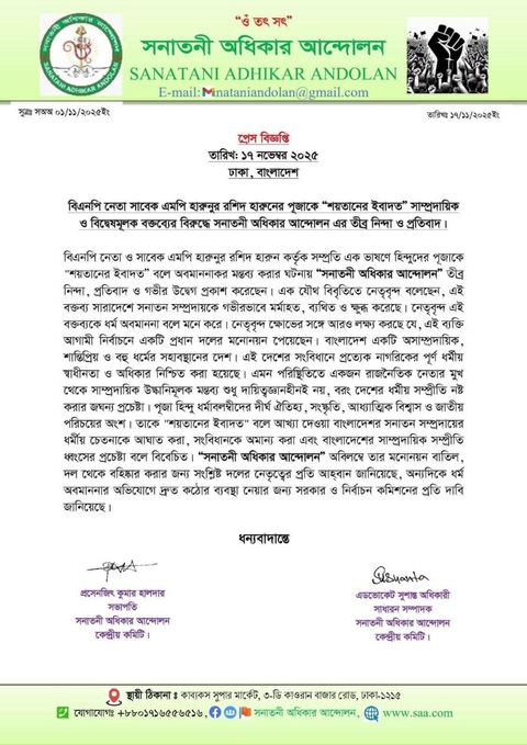 বিএনপি নেতা হারুনুর রশিদের সাম্প্রদায়িক বক্তব্যে সনাতন সংগঠনগুলোর তীব্র নিন্দা–প্রতিবাদ