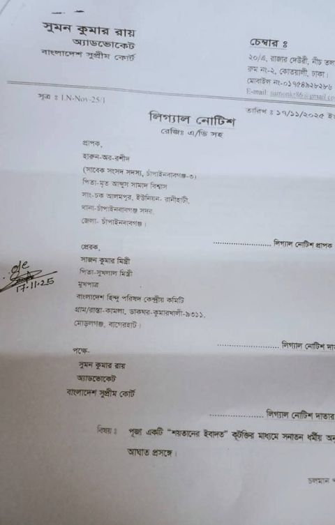 সনাতন ধর্মের অন্যতম প্রধান আচার ‘পূজা’–কে “শয়তানের ইবাদত” বলে উল্লেখ করায় সাবেক সংসদ সদস্য জনাব হারুনুর রশিদের বিরুদ্ধে আইনগত ব্যবস্থা গ্রহণ করা হয়েছে। বাংলাদেশ হিন্দু পরিষদ কেন্দ্রীয় কমিটির মুখপাত্র সাজন কুমার মিস্ত্রীর পক্ষ থেকে ১৭ নভেম্বর ২০২৫ তারিখে পাঠানো এই লিগ্যাল নোটিশে হারুনুর রশিদকে ৪৮ ঘণ্টার মধ্যে প্রকাশ্যে নিঃশর্ত ক্ষমা চাইতে নির্দেশ দেওয়া হয়েছে।