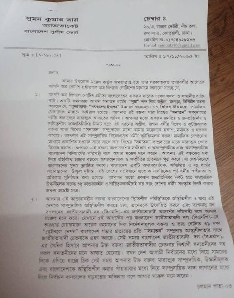 “হারুনুর রশিদ মহোদয় তাঁর বক্তব্যের মাধ্যমে আমাদের হৃদয়ে গভীর আঘাত করেছেন। তাই ৪৮ ঘণ্টার মধ্যে তাঁকে সনাতনী হিন্দু সম্প্রদায়ের কাছে ক্ষমা চাইতেই হবে। সেই কারণেই আমার পক্ষ থেকে আইনগত নোটিশ পাঠানো হয়েছে। আশা করি তিনি ভুল বুঝতে পেরে সন্তোষজনক বার্তা দেবেন।”