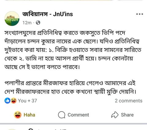 জকসু নির্বাচনের ইতিহাসে ভুয়া তথ্য, গুজব, চরিত্রহনন ও বিভ্রান্তিমূলক পোস্ট নতুন নয়। তবে এবারের ঘটনাটি বিশেষভাবে আলোচনায় এসেছে কারণ এটি সরাসরি ধর্মীয় পরিচয়কে ইস্যু করে একটি সম্পূর্ণ সম্প্রদায়ের বিরুদ্ধে অবমাননাকর ও সন্দেহজনক বর্ণনা তৈরি করছে। শিক্ষার্থীদের মধ্যে তাই উদ্বেগ বেড়েছে যে নির্বাচনকে কেন্দ্র করে ধর্মীয় বিভাজন সৃষ্টি করার চেষ্টা করা হচ্ছে, যা ক্যাম্পাসের শান্তিপূর্ণ পরিবেশের জন্য হুমকি।