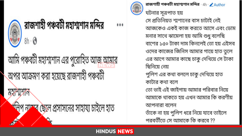 ভুক্তভোগী পুরোহিত সম্প্রতি রাজশাহী পঞ্চবটী মহাশ্মশানের অফিসিয়াল ফেসবুক আইডি থেকে প্রকাশিত এক পোস্টে জানান, দীর্ঘদিন ধরেই শ্মশানে নিয়মিত দায়িত্ব পালনের সময় তাকে বিভিন্নভাবে বাধা দেওয়া হচ্ছে। হুমকি, ভয়ভীতি প্রদর্শন এবং শারীরিকভাবে আক্রমণের ঘটনাও ঘটেছে বলে তিনি উল্লেখ করেন। সর্বশেষ ঘটনায় আলিপ নামের এক ব্যক্তি তাকে সরাসরি প্রাণনাশের হুমকি দেন। পুরোহিতের অভিযোগ অনুযায়ী, তিনি যদি প্রশাসনের কাছে সহায়তা চান বা অভিযোগ করেন, তাহলে তার হাত কেটে নেওয়া হবে বলে প্রকাশ্যে হুমকি দেওয়া হয়।