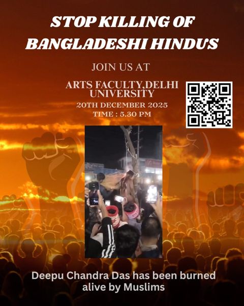 বাংলাদেশে সংখ্যালঘু হিন্দু সম্প্রদায়ের ওপর নির্যাতন ও সহিংসতার অভিযোগের প্রতিবাদে আগামী ২০ ডিসেম্বর দিল্লি বিশ্ববিদ্যালয়ের আর্টস ফ্যাকাল্টি চত্বরে এক প্রতিবাদ সমাবেশের আয়োজন করা হয়েছে।